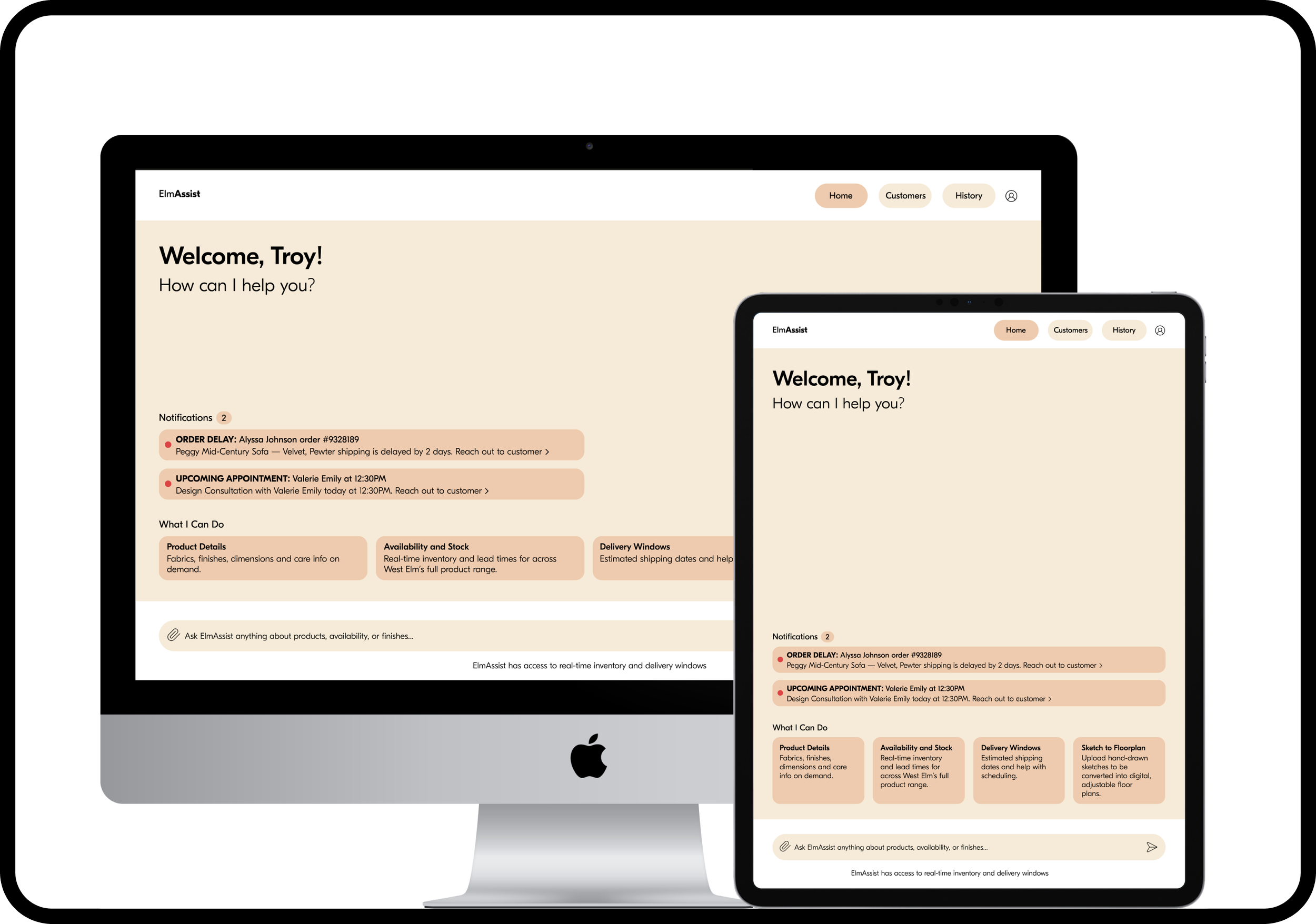 An AI-powered tablet assistant that helps sales associates instantly find product details, check availability within delivery windows, and generate custom floor plans.