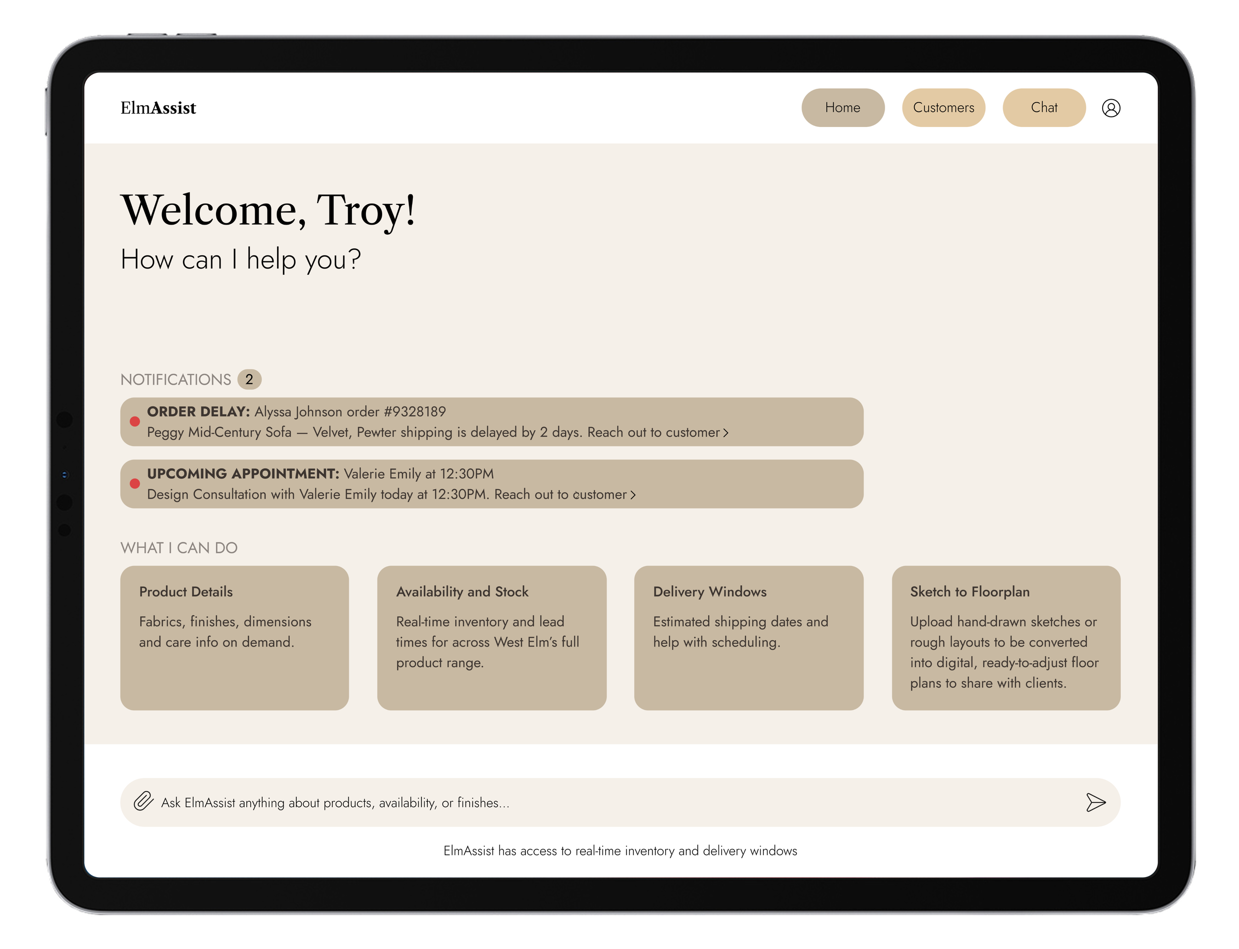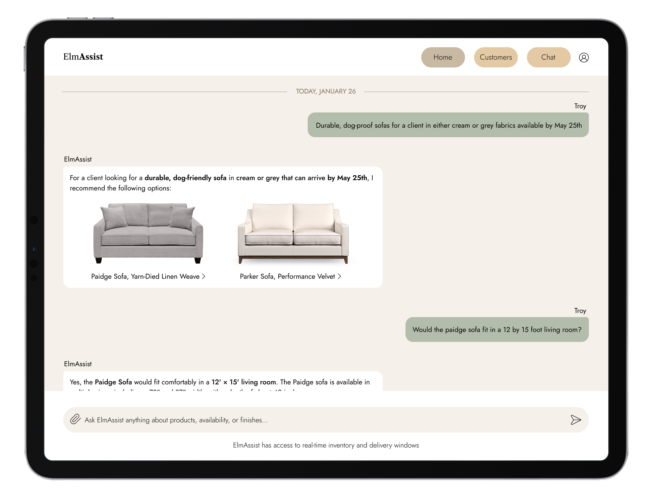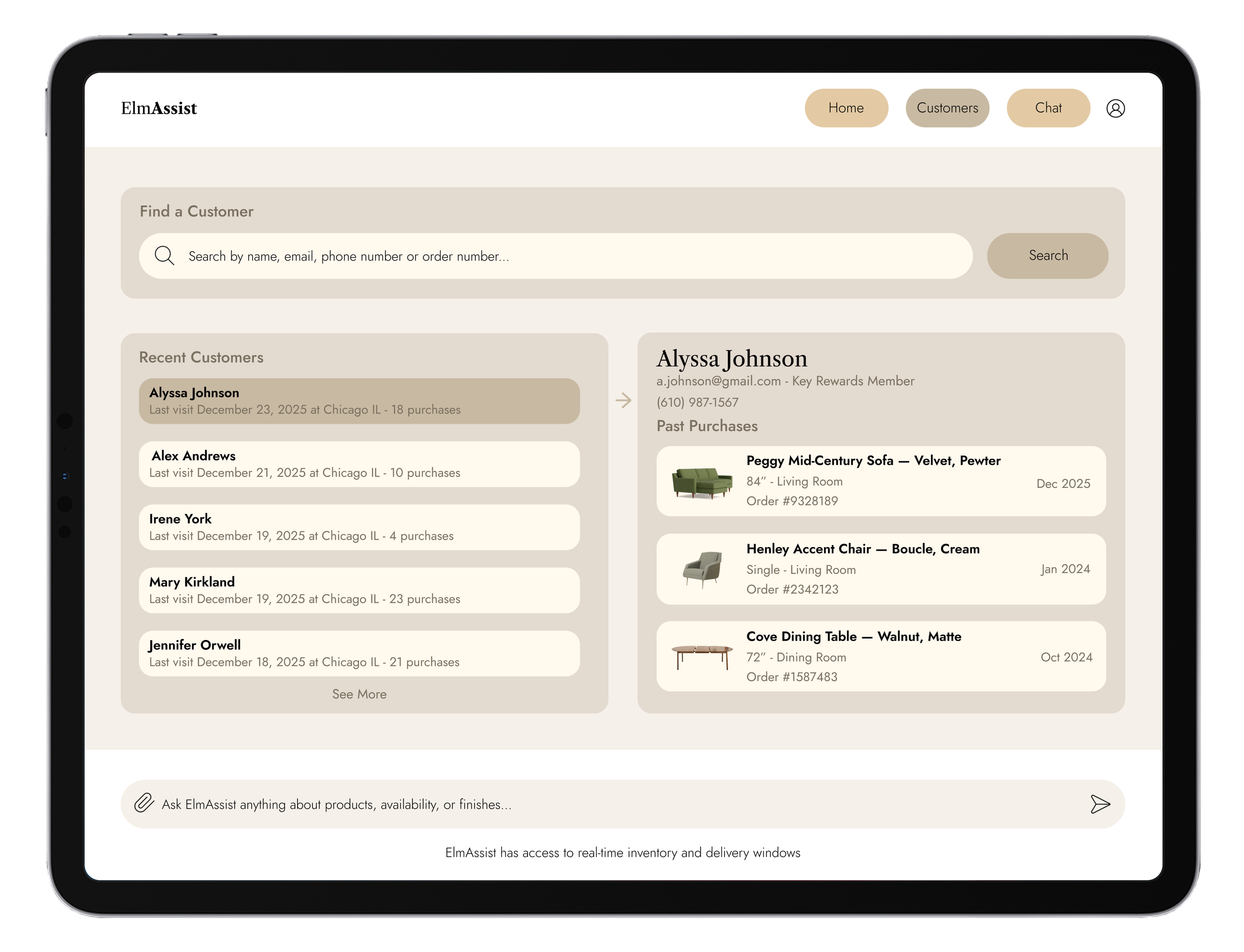 Sales associates know their products, but no one can remember everything. ElmAssist fills in the gaps by pulling up product details on the spot, turning hand-drawn sketches into floor plans, and suggesting pieces that complement what a customer already owns at home. Rather than letting a sale fall apart over a fabric that won't arrive in time, associates can confidently offer alternatives that fit the customer's home and their schedule.
