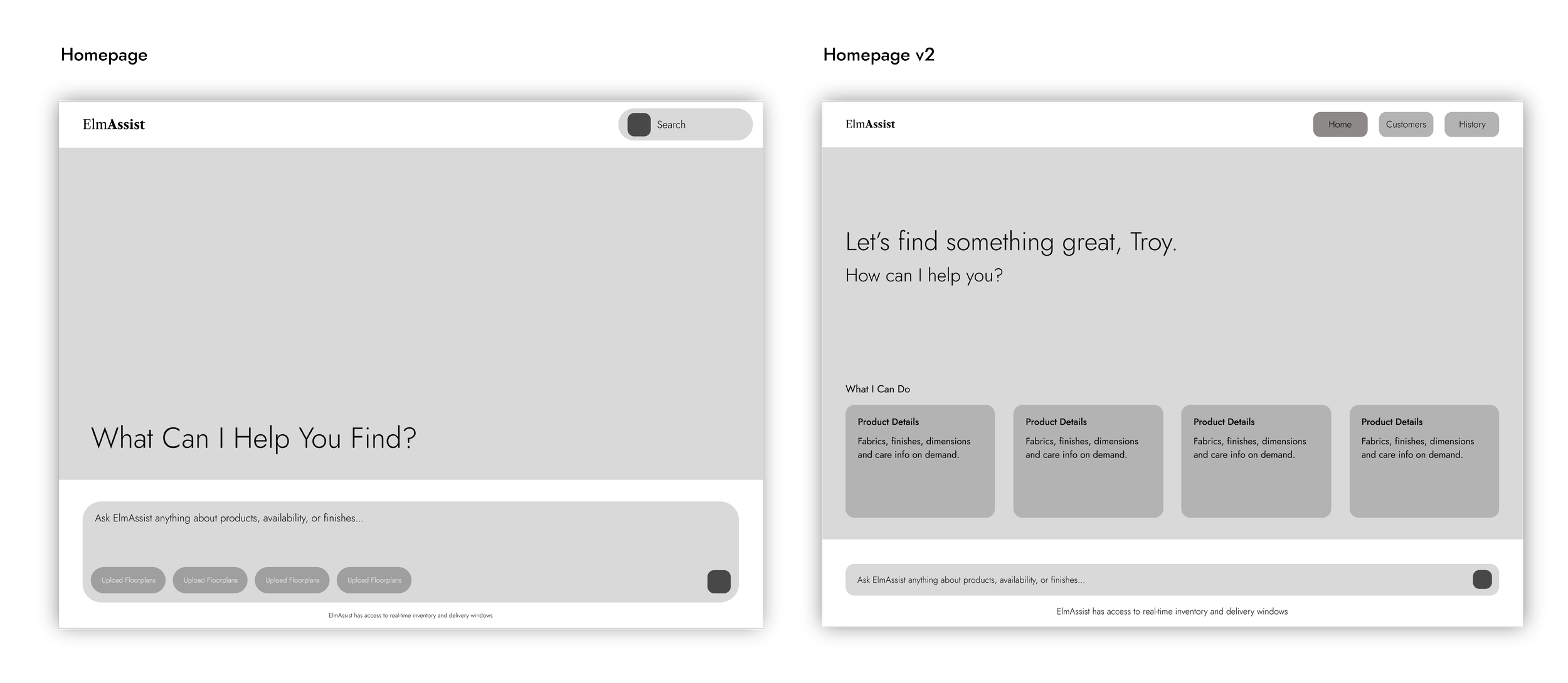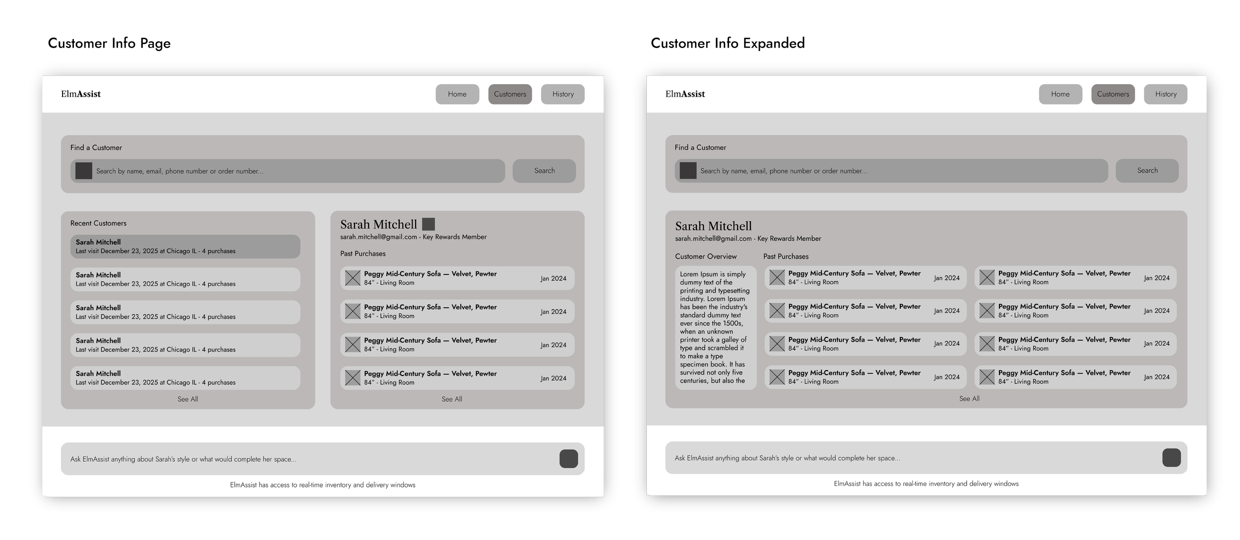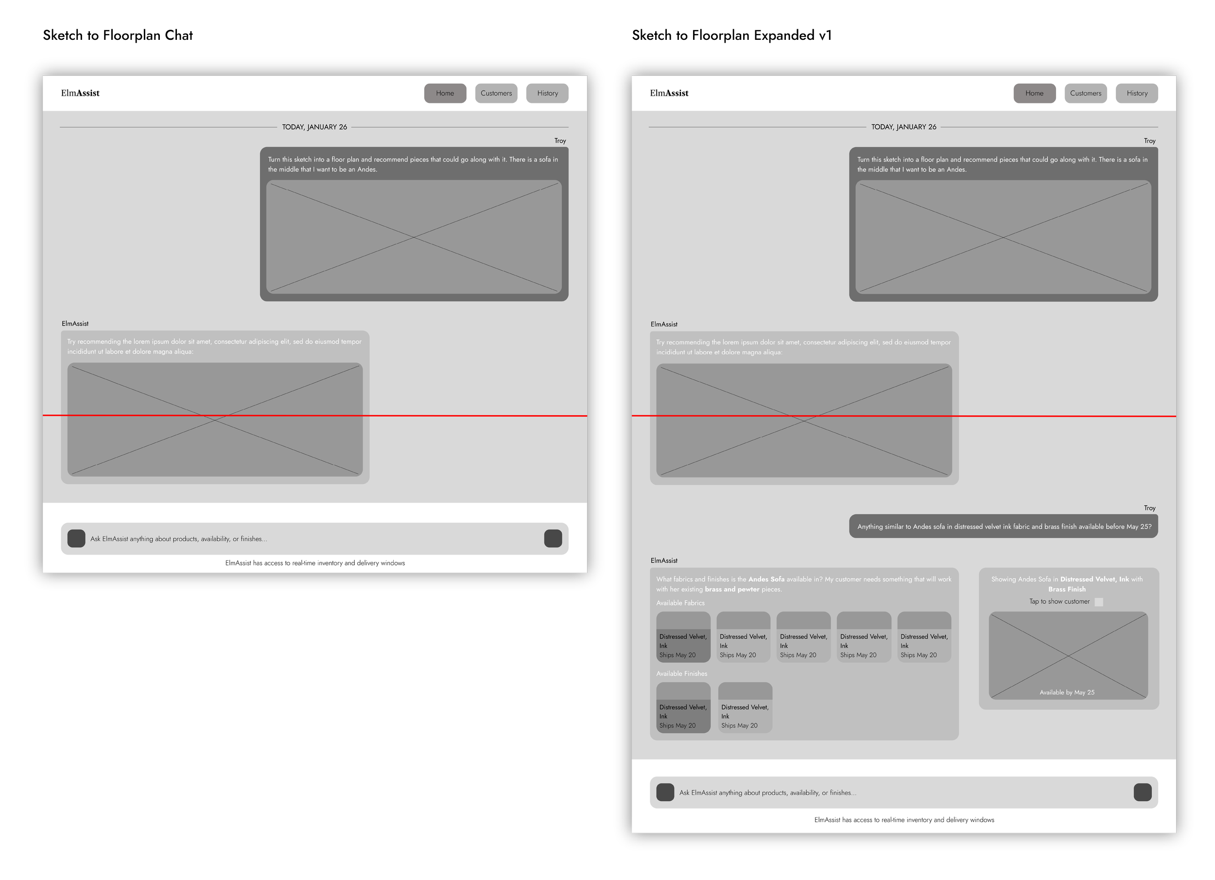 Sales associates know their products, but no one can remember everything. ElmAssist fills in the gaps by pulling up product details on the spot, turning hand-drawn sketches into floor plans, and suggesting pieces that complement what a customer already owns at home. Rather than letting a sale fall apart over a fabric that won't arrive in time, associates can confidently offer alternatives that fit the customer's home and their schedule.