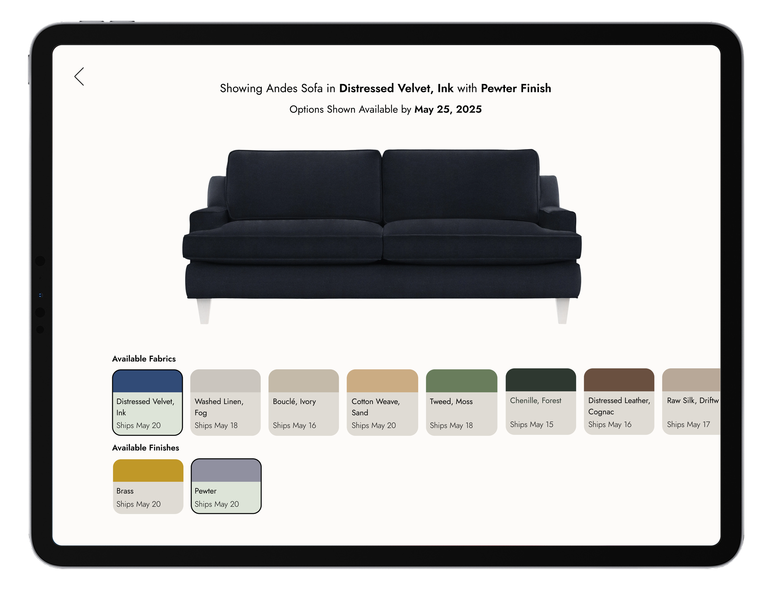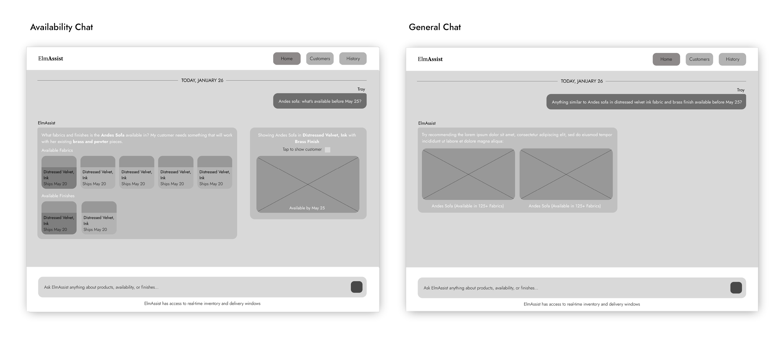 One of the features she noticed and spoke more about was in the availability chat, where there could be an option to show the customer in real time what fabrics and finishes are available on a certain piece by a certain date. She said she wishes she had something like that, instead of having to click through multiple options on the computer with the client where they might see something they like, only to be disappointed it wasn’t available for 10+ weeks.