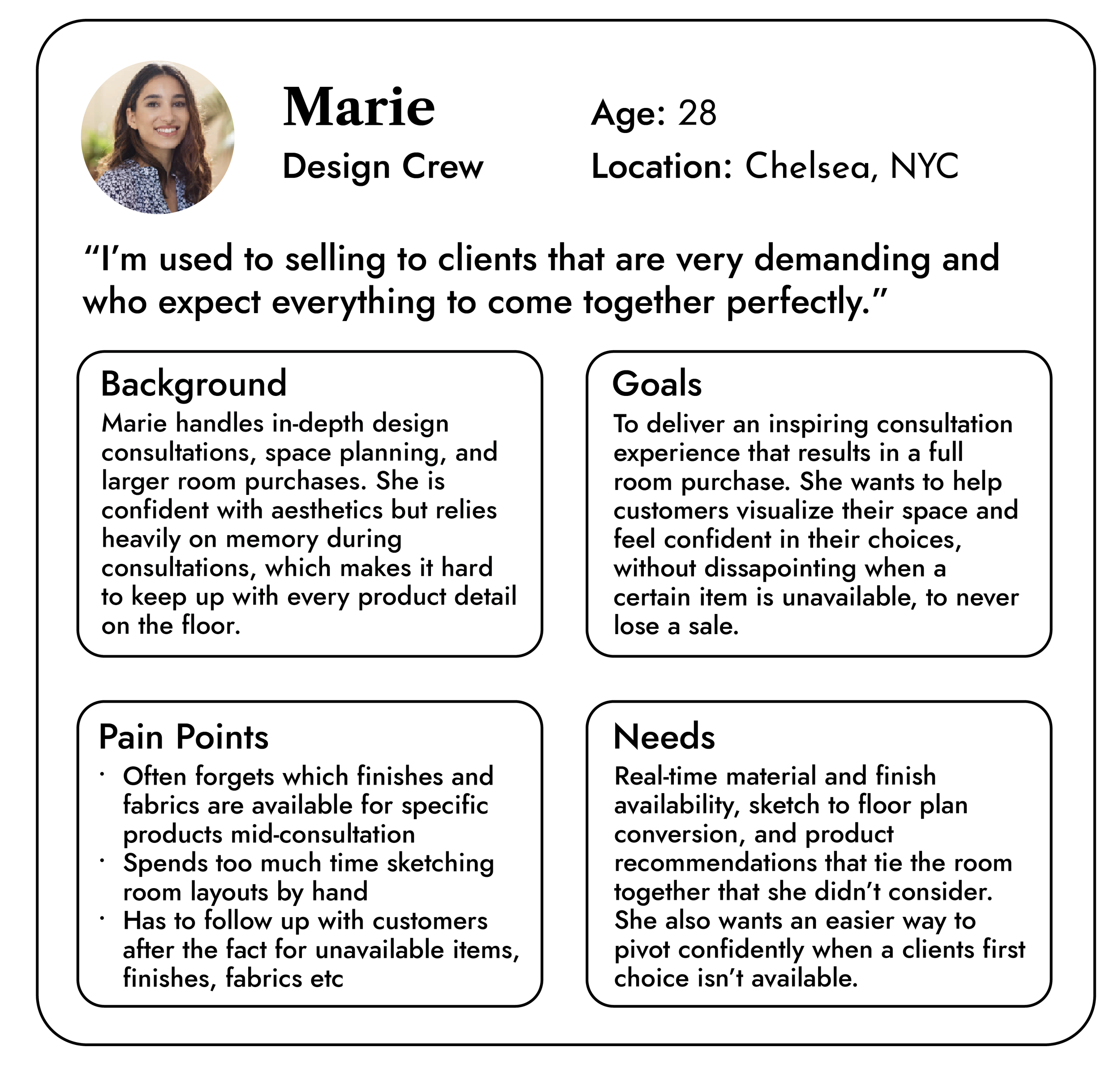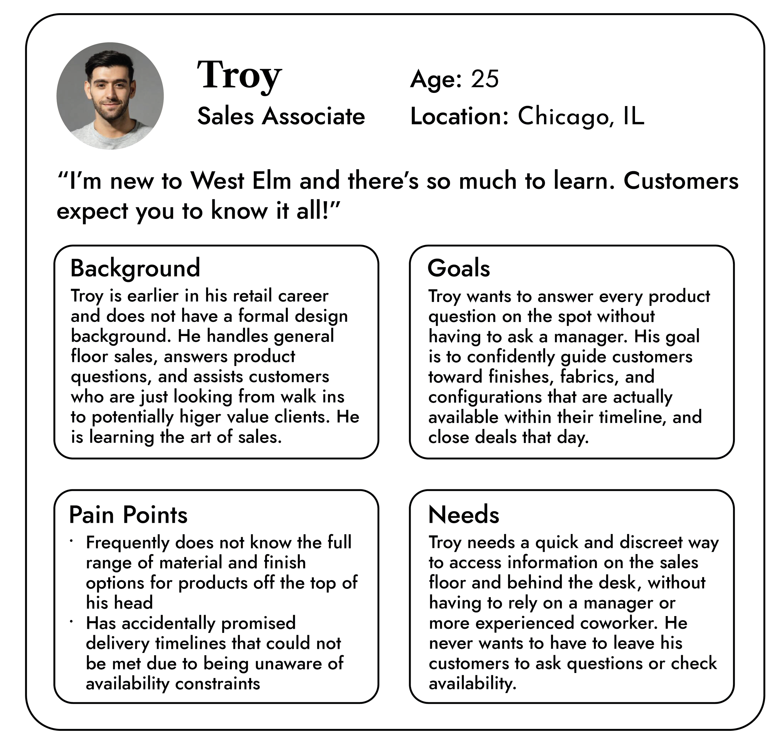 I interviewed a Design Crew member at a West Elm in the Philadelphia suburbs to find out their pain points when it comes to selling furniture and making floor plans for clients. She gave me insights on two types of West Elm employees that struggle with information overload: